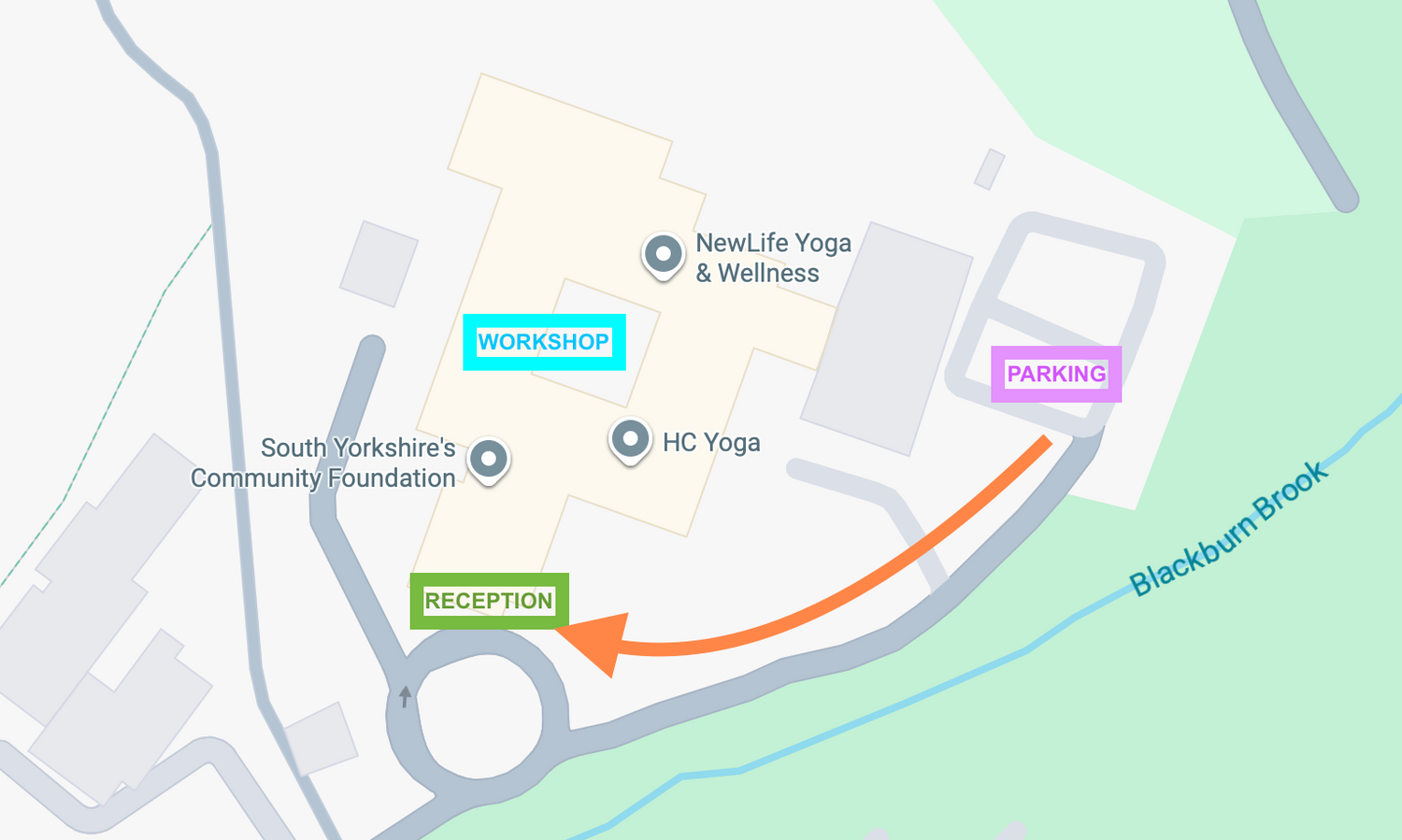 Follow the orange arrow up to Reception (Green) and ring the buzzer to access the building.